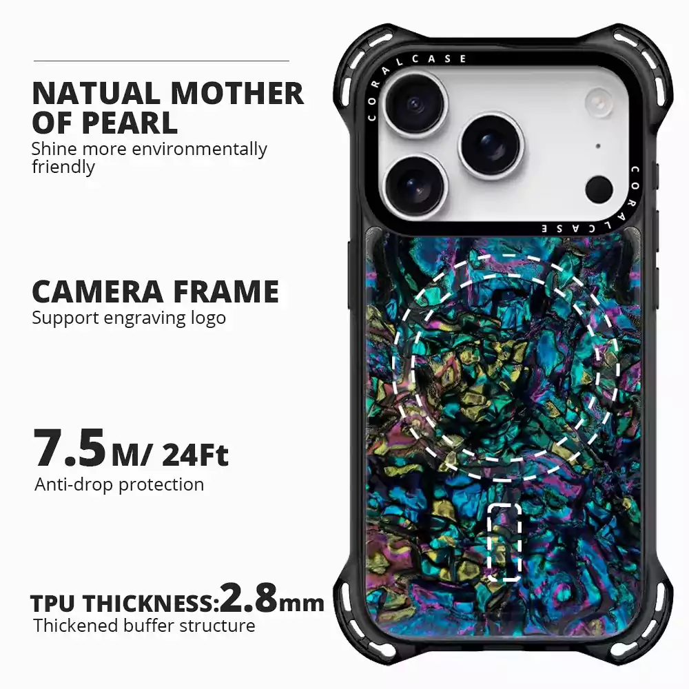 The Coral Case Abalone Shell Bounce Case is the perfect blend of luxury and durability for iPhone users. Crafted from premium-quality TPU, PC, and Epoxy Resin, the case features a genuine abalone shell finish, adding an elegant touch while providing long-lasting protection.